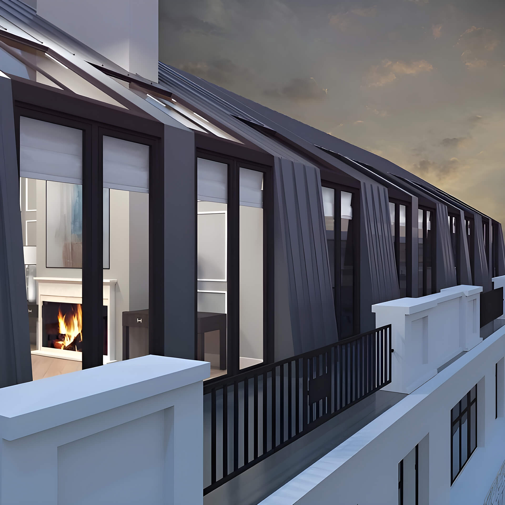 Интерьеры дома выполнены с использованием премиальных материалов, таких как натуральный камень и дерево. Высокие потолки, просторные комнаты и панорамные окна усиливают ощущение простора и роскоши. Особого внимания заслуживают пентхаусы, оборудованные открытыми террасами и каминами, что делает их идеальным местом для жизни и отдыха.